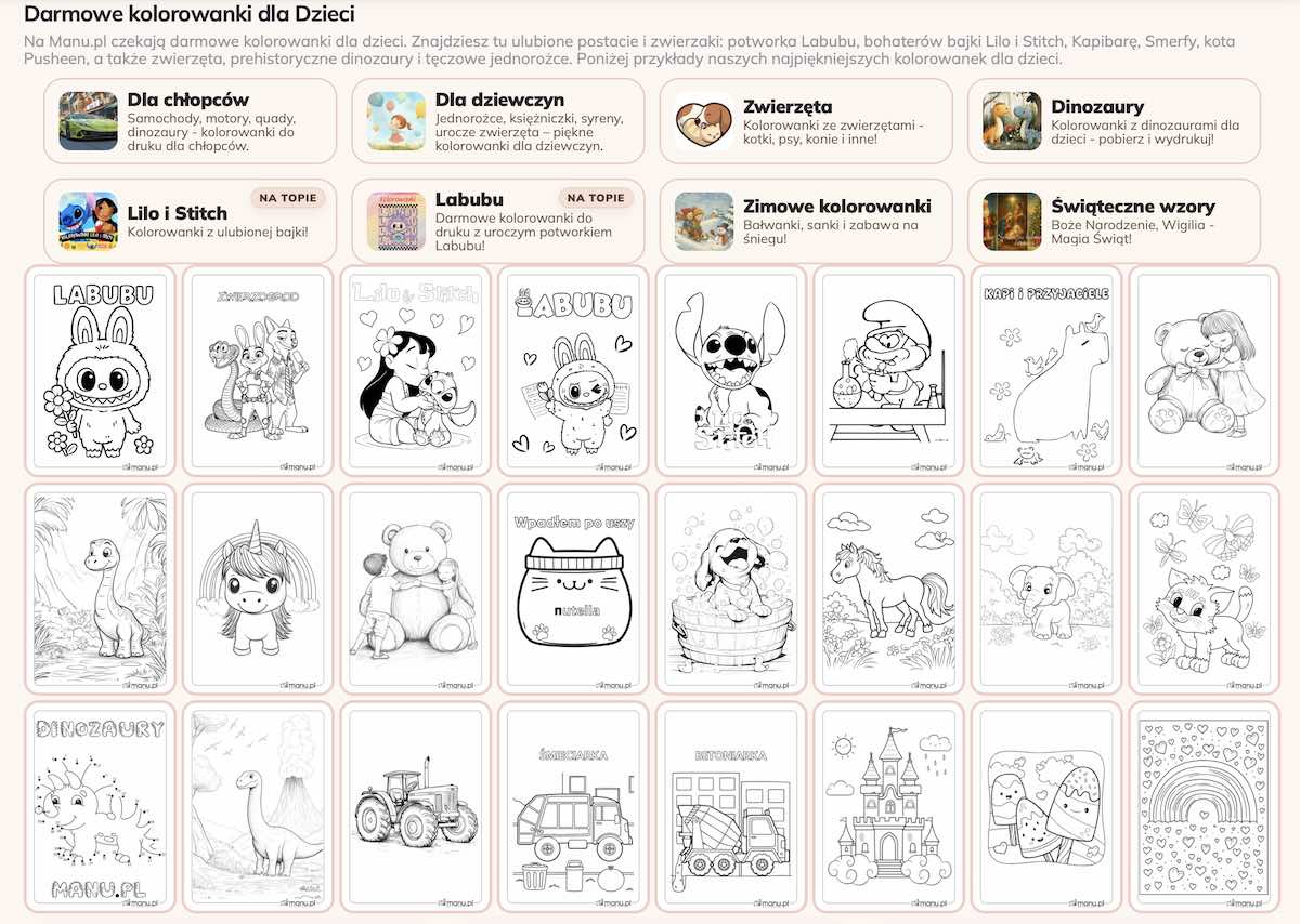 Widok strony manu.pl pokazuje, jak duży wybór kolorowanek do druku jest dziś dostępny dla dzieci w różnym wieku. Znajdziemy tu zarówno proste ilustracje dla młodszych dzieci, jak i bardziej szczegółowe rysunki dla starszych, które lubią dłużej skupić się na jednej pracy. Różnorodność motywów — od zwierząt i bajkowych postaci po pojazdy i sceny z codziennych przygód — sprawia, że dziecko może samodzielnie wybrać coś, co je zainteresuje. To szczególnie ważne w domu, gdzie kolorowanie ma być przyjemnością, a nie kolejnym zadaniem do wykonania. Taki wybór pozwala łatwo dopasować kolorowanki do nastroju dziecka i chwili dnia, bez pośpiechu i bez ekranu w tle.